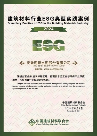 11月13至14日,中國(guó)建筑材料聯(lián)合會(huì)在北京召開2024年度建筑材料行業(yè)大會(huì),會(huì)上發(fā)布了中國(guó)建筑材料行業(yè)ESG發(fā)展研究報(bào)告(2024)及典型案例,海螺水泥憑借在ESG方面的卓越實(shí)踐,成功入選“2024年度建筑材料行業(yè)ESG典型實(shí)踐案例”。