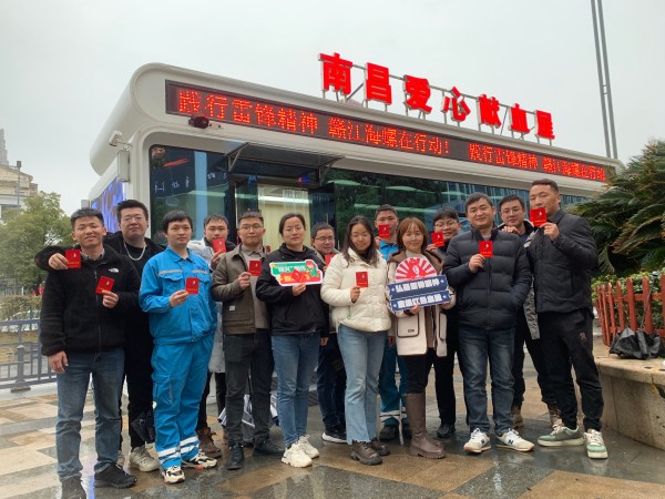南昌市獻血屋前,贛江海螺的14名青年志愿者們完成無償獻血后,在蒙蒙細雨中留下“愛心合影”。