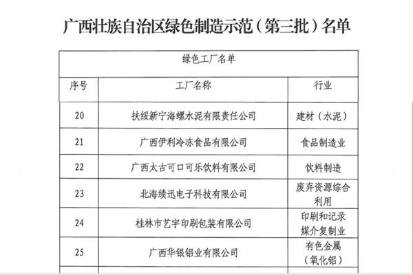 近日,廣西自治區(qū)工業(yè)信息化廳發(fā)布廣西第三批綠色工廠名單,扶綏新寧海螺水泥有限責(zé)任公司榜上有名,榮獲“自治區(qū)級(jí)綠色工廠”榮譽(yù)稱(chēng)號(hào)。