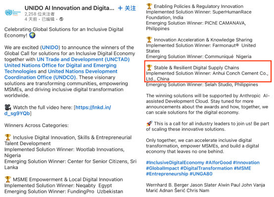近日,海螺集團下屬“安徽海螺水泥股份有限公司——海螺云工大模型”在聯(lián)合國工業(yè)發(fā)展組織等機構(gòu)于2025年7月發(fā)起的“2025包容性數(shù)字經(jīng)濟全球解決方案征集”中,榮獲: 穩(wěn)定與韌性的數(shù)字供應鏈 類別 最佳實施方案獎 獎項。