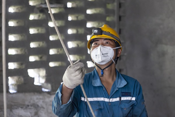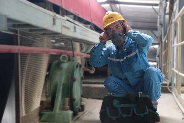 正在前往一線喂料樓的章利,勞保服已被汗水所浸透,干濕分明,手套、安全帽、勞保服在保障員工安全的同時(shí),也見證著海螺人默默的付出。(龍新陽(yáng)/攝)