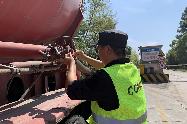 日光正盛,宣城海螺一號(hào)門外,保衛(wèi)人員陳程正在對(duì)散裝水泥出廠車輛進(jìn)行鉛封,站好崗、守好責(zé),他們是夏天的“炎值”和“門面”擔(dān)當(dāng)。(謝能/攝)