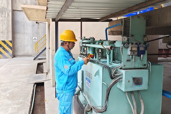 在高溫風(fēng)機(jī)油站前,制造分廠副廠長(zhǎng)羅紅波緊盯著儀器讀數(shù),對(duì)設(shè)備運(yùn)行情況進(jìn)行逐一點(diǎn)檢?!霸O(shè)備‘中暑生病’,也同樣十分危險(xiǎn),點(diǎn)檢工作可馬虎不得?!绷_紅波說(shuō)。(朱貴宏/攝)
