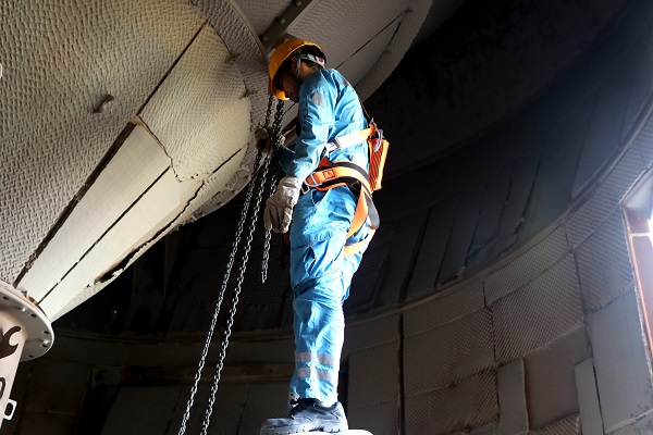 三線預(yù)熱器密尾煙室不斷往外噴涌著滾滾熱浪,身著高溫防護(hù)服的巡檢員譚平,正在對(duì)煙室內(nèi)的結(jié)皮進(jìn)行清理,保障回轉(zhuǎn)窯穩(wěn)定運(yùn)行。(秦建明/攝)