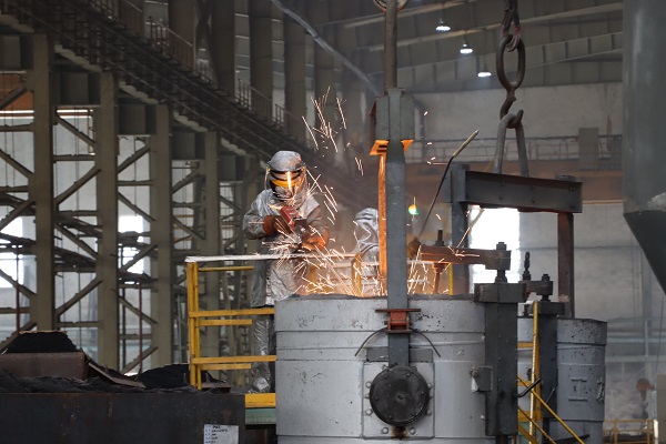 8月17日清晨,海川裝備公司180輥壓機(jī)軸承座澆注生產(chǎn)作業(yè)正在緊張有序地進(jìn)行中,為了保證這個(gè)重達(dá)近10噸的“大家伙”最終的澆注質(zhì)量,鑄造分廠澆注工程國(guó)強(qiáng)正在和工友們進(jìn)行著最后的測(cè)溫工作,厚重的鋁箔防火隔熱服內(nèi),汗水順著皮膚不斷滑落,而他們依舊全神貫注,他說(shuō):“鋼包測(cè)溫是澆注工序的最后一項(xiàng)重要工作,必須保證每個(gè)動(dòng)作規(guī)范到位,心靜自然涼,專注在手上,也就感覺不到熱了?!保▍雾嵶?攝)