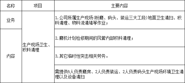根據(jù)江門海螺水泥有限公司生產(chǎn)經(jīng)營需求,為確保招標(biāo)人生產(chǎn)現(xiàn)場(粉磨、碼頭、裝運三大工段)地面衛(wèi)生清掃、積料清理、物料流清堵等作業(yè)開展,本著“公開、公平、公正”的原則,選擇經(jīng)營能力較好、經(jīng)營資質(zhì)合格、服務(wù)質(zhì)量較強(qiáng)的勞務(wù)公司承接招標(biāo)人勞務(wù),歡迎具備條件的單位參加,現(xiàn)將有關(guān)事項公示如下: