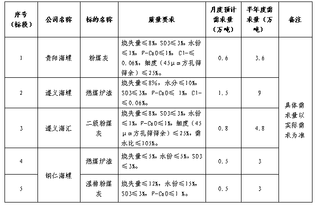 海螺水泥貴州區(qū)域擬對(duì)2021年下半年水泥生產(chǎn)用粉煤灰、燃煤爐渣進(jìn)行二次公開(kāi)招標(biāo),選定中標(biāo)單位,現(xiàn)將相關(guān)招標(biāo)事宜公示如下: