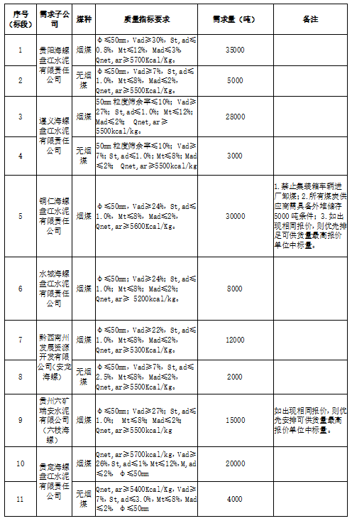 海螺水泥貴州區(qū)域擬對(duì)2021年7月21日至2021年8月20日生產(chǎn)用煤炭進(jìn)行公開招標(biāo),選定中標(biāo)單位,現(xiàn)將相關(guān)招標(biāo)事宜公示如下: