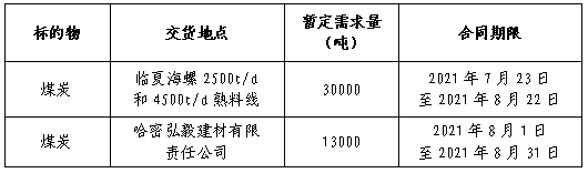 為做好臨夏海螺及哈密弘毅公司8月份煤炭采購工作,滿足生產(chǎn)需要,本著“公開、公平、公正”的原則,擬對(duì)煤炭供貨進(jìn)行公開招標(biāo),現(xiàn)將招標(biāo)采購信息發(fā)布如下: