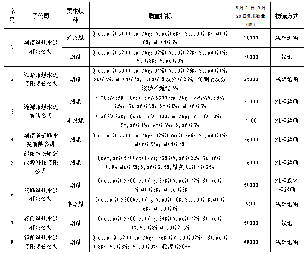 根據(jù)2021年8月21日-2021年9月20日海螺水泥湖南區(qū)域各子公司煤炭需求,現(xiàn)擬對(duì)煤炭進(jìn)行公開招標(biāo),選定中標(biāo)人,為體現(xiàn)公平、公正、公開的原則,拓寬采購渠道,現(xiàn)將招標(biāo)相關(guān)事宜公告如下: