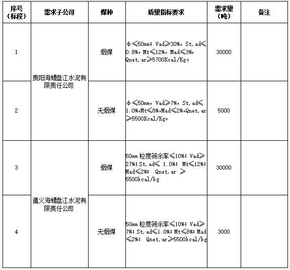 海螺水泥貴州區(qū)域擬對(duì)2021年8月21日至2021年9月20日生產(chǎn)用煤炭進(jìn)行公開(kāi)招標(biāo),選定中標(biāo)單位,現(xiàn)將相關(guān)招標(biāo)事宜公示如下: