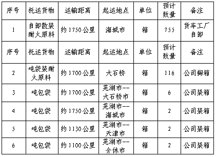1.2起止地點:原料裝運起點為遼寧省海城市/大石橋市供貨單位指定裝貨倉庫—終點安徽海螺暹羅耐火材料公司倉庫;噸袋裝運為海螺耐火材料公司倉庫至大石橋市、海城市、天津市、介休市。