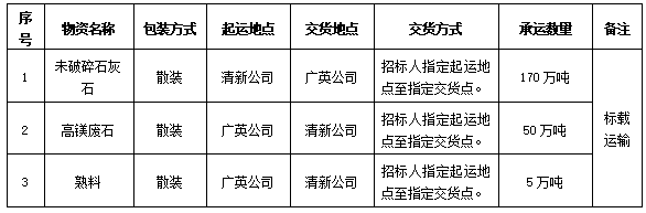 根據(jù)生產(chǎn)用料需要,廣東清新水泥有限公司及廣東清遠(yuǎn)廣英水泥有限公司擬對(duì)兩公司間石灰石、石粉、熟料等原材料運(yùn)輸業(yè)務(wù)面向社會(huì)公開(kāi)招標(biāo),本著“公開(kāi)、公平、公正”的競(jìng)爭(zhēng)原則,選擇具備經(jīng)營(yíng)能力較好、運(yùn)輸資質(zhì)合格、保供和服務(wù)能力強(qiáng)的運(yùn)輸保供單位,歡迎具備條件的運(yùn)輸單位參加,現(xiàn)將有關(guān)事項(xiàng)公示如下: