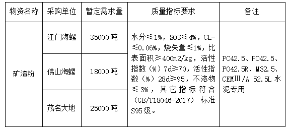 按照廣東區(qū)域供應專業(yè)組2021年招標計劃安排,安徽海螺水泥股份有限公司廣東區(qū)域下屬的江門海螺、佛山海螺、茂名大地三家公司擬對2021年下半年礦渣粉采購進行聯(lián)合公開招標,為進一步體現(xiàn)公平、公正、公開的原則,拓寬采購渠道,提高采購質量,現(xiàn)將相關事宜公告如下: