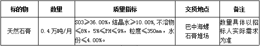 根據(jù)巴中海螺生產(chǎn)經(jīng)營需求,現(xiàn)對天然石膏采購業(yè)務(wù)進(jìn)行公開招標(biāo),為體現(xiàn)公平、公正、公開、透明的原則,現(xiàn)將招標(biāo)相關(guān)事宜公告如下: