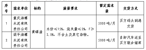 為進(jìn)一步提升黃磷渣采購(gòu)招標(biāo)的公平、公正、公開(kāi)透明性,根據(jù)重慶、梁平海螺黃磷渣需求,現(xiàn)組織開(kāi)展黃磷渣采購(gòu)招標(biāo),特將招標(biāo)事宜公告如下: