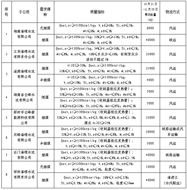 根據(jù)2021年10月21日-2021年11月20日海螺水泥湖南區(qū)域各子公司煤炭需求,現(xiàn)擬對(duì)煤炭進(jìn)行公開(kāi)招標(biāo),選定中標(biāo)人,為體現(xiàn)公平、公正、公開(kāi)的原則,拓寬采購(gòu)渠道,現(xiàn)將招標(biāo)相關(guān)事宜公告如下: