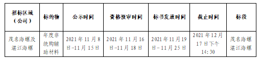 茂名海螺及湛江海螺2022年度非統(tǒng)購輔材合同即將到期,為做好兩公司生產(chǎn)用輔助材料的供應(yīng)工作,本著“公開、公平、公正、透明”的原則,由茂名海螺牽頭,組織湛江海螺開展2022年度非統(tǒng)購輔材聯(lián)合招標(biāo)工作,此次招標(biāo)擬采取公開招標(biāo)的方式,招標(biāo)基本信息發(fā)布如下: