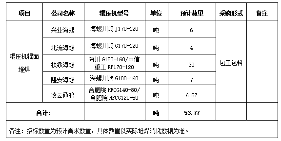 為拓寬采購渠道,提高采購質量,本著“公開、公平、公正”的競爭原則,廣西區(qū)域六家公司(興業(yè)海螺、北流海螺、扶綏海螺、隆安海螺以及凌云通鴻)擬對2022年水泥磨輥壓機輥面堆焊進行聯合招標,選擇經營能力較好、經營資質合格、保供和服務能力較強的廠家和耐磨焊絲生產或供應單位,歡迎具備條件的廠家和單位參加,現將有關事項公示如下: