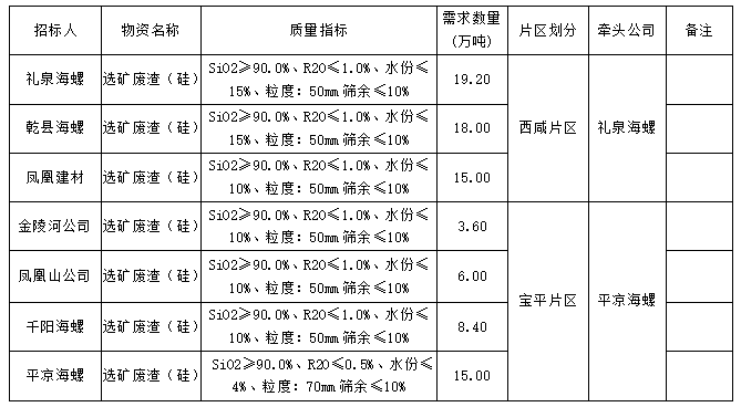 根據(jù)禮泉海螺、平?jīng)龊B?、千?yáng)海螺、乾縣海螺、金陵河公司、鳳凰山公司及鳳凰建材等7家公司生產(chǎn)經(jīng)營(yíng)計(jì)劃,現(xiàn)擬對(duì)2022年生產(chǎn)用選礦廢渣(硅)采購(gòu)組織招標(biāo),為進(jìn)一步體現(xiàn)公平、公正、公開(kāi)透明的原則,此次招標(biāo)將在安徽海螺水泥股份有限公司陽(yáng)光采購(gòu)平臺(tái)公開(kāi)進(jìn)行,現(xiàn)將招標(biāo)采購(gòu)信息發(fā)布如下: