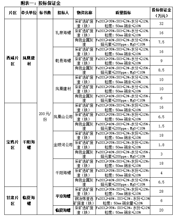 根據(jù)2022年度禮泉海螺、平?jīng)龊B?、千陽海螺、乾縣海螺、臨夏海螺、鳳凰建材、金陵河公司、鳳凰山公司等8家公司生產(chǎn)經(jīng)營計(jì)劃,現(xiàn)對2022年度鐵質(zhì)材料(直供)采購組織招標(biāo),為進(jìn)一步體現(xiàn)公平、公正、公開透明的原則,此次招標(biāo)將在安徽海螺水泥股份有限公司陽光采購平臺公開進(jìn)行,現(xiàn)將招標(biāo)采購信息發(fā)布如下: