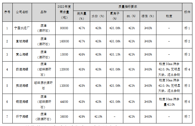 根據(jù)2022年度安徽海螺水泥股份有限公司寧國(guó)水泥廠(chǎng)(以下簡(jiǎn)稱(chēng):寧國(guó)水泥廠(chǎng))、安徽宣城海螺水泥有限公司(以下簡(jiǎn)稱(chēng):宣城海螺)、黃山海螺水泥有限責(zé)任公司(以下簡(jiǎn)稱(chēng);黃山海螺)、安徽銅陵海螺水泥有限公司(以下簡(jiǎn)稱(chēng):銅陵海螺)、安徽荻港海螺水泥股份有限公司(以下簡(jiǎn)稱(chēng):荻港海螺)、蕪湖海螺水泥有限公司(以下簡(jiǎn)稱(chēng):蕪湖海螺)、安徽懷寧海螺水泥有限公司(以下簡(jiǎn)稱(chēng):懷寧海螺)生產(chǎn)需求,對(duì)水泥生產(chǎn)配料用煤矸石采購(gòu)進(jìn)行聯(lián)合公開(kāi)招標(biāo),為體現(xiàn)公平、公正、公開(kāi)的原則,同時(shí)為拓寬采購(gòu)渠道,提高采購(gòu)質(zhì)量,現(xiàn)將招標(biāo)相關(guān)事宜公告如下: