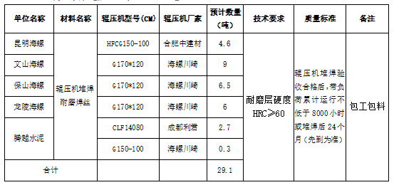 本著“公開、公平、公正”的原則,海螺水泥云南區(qū)域下屬昆明海螺水泥有限公司(以下簡稱:昆明海螺)、文山海螺水泥有限責任公司(以下簡稱:文山海螺)、保山海螺水泥有限責任公司(以下簡稱:保山海螺)、龍陵海螺水泥有限責任公司(以下簡稱:龍陵海螺)、騰沖市騰越水泥有限公司(以下簡稱:騰越水泥)五家公司聯(lián)合組織開展耐磨焊絲堆焊公開招標,招標網站“海螺物資陽光采購平臺”,歡迎具備條件的廠家和單位參加?,F(xiàn)將招標基本信息發(fā)布如下: