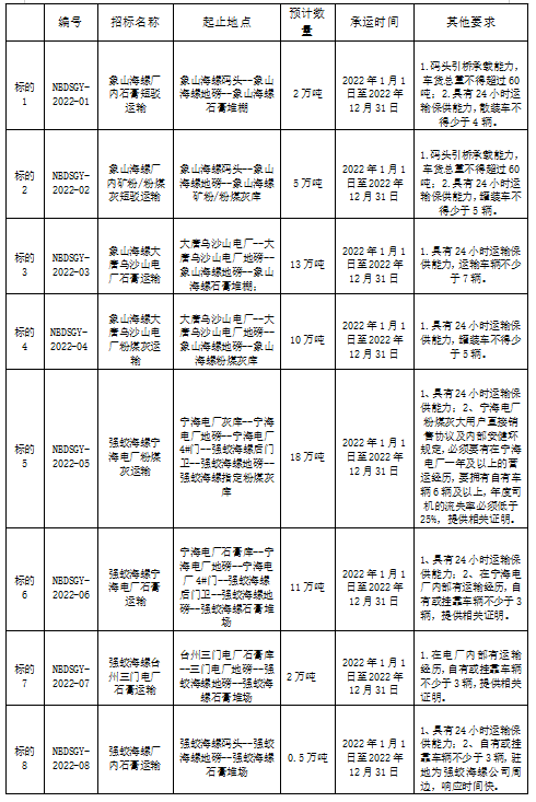1、招標(biāo)公示及投標(biāo)報(bào)名時(shí)間:2021年11月19日--2021年11月26日(北京時(shí)間上午8:00-12:00,下午13:30-17:30),各單位需滿足招標(biāo)要求,并提供相關(guān)證明材料作為資格評(píng)審資料(法人代表授權(quán)書(shū)、營(yíng)業(yè)執(zhí)照副本、道路運(yùn)輸經(jīng)營(yíng)許可證、投標(biāo)報(bào)名人身份證等原件或復(fù)印件加蓋公章,電廠粉煤灰運(yùn)輸參與車(chē)輛需提供GPS),報(bào)名地點(diǎn)象山海螺財(cái)務(wù)處業(yè)務(wù)室。