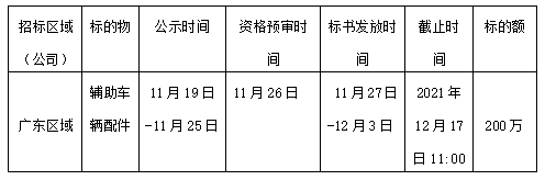 廣東區(qū)域擬對2022年度輔助車輛配件項目進行公開招標,為進一步體現公平、公正、公開的原則,拓寬采購渠道,提高招標質量,現將相關事宜公告如下: