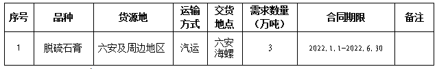 六安海螺水泥有限責(zé)任公司擬對2022年上半年脫硫石膏采購進(jìn)行公開招標(biāo),選定中標(biāo)人。現(xiàn)將相關(guān)事宜公告如下: