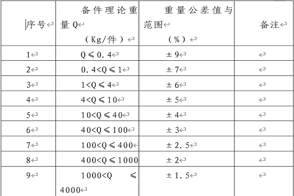 4、耐熱件備件的鑄造重量誤差應(yīng)符合國家有關(guān)標(biāo)準(zhǔn)(GB/T11351-89)及行業(yè)規(guī)定,其具體重量誤差范圍如下表: