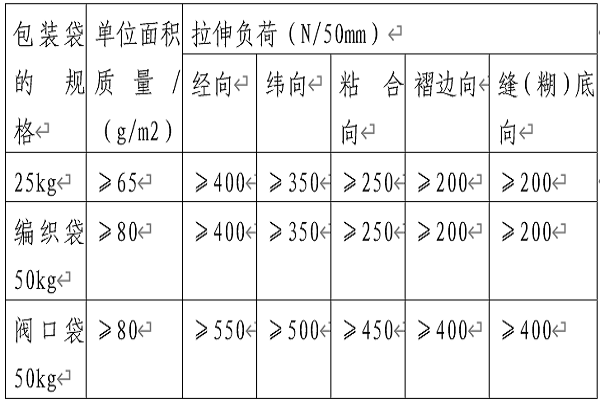 a.其中復(fù)膜袋單位面積質(zhì)量≥80 g/m2,含復(fù)膜質(zhì)量且復(fù)膜質(zhì)量應(yīng)不小于6g/m2,閥口袋含復(fù)膜質(zhì)量且復(fù)膜質(zhì)量應(yīng)不小于18g/m2