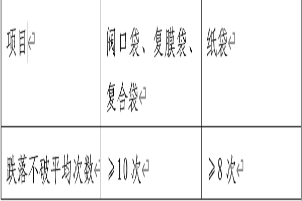 任取五個(gè)樣袋按規(guī)定熱處理(除紙袋外)后以跌落試驗(yàn)不破損次數(shù)表示,要求不低于見表2規(guī)定。
