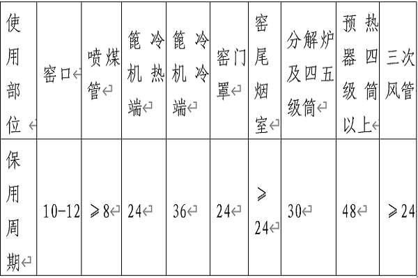 3、性能保證:在需方正常操作情況下,窯運(yùn)轉(zhuǎn)率≥70%,各種澆注料按使用部位需滿足如下的最短使用周期:
