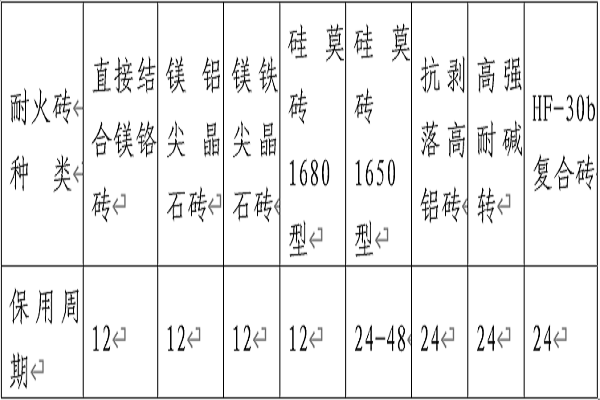 3、性能保證:在需方正常操作情況下,窯運(yùn)轉(zhuǎn)率≥70%,各種耐火磚最低保證使用周期情況如下: 單位:月