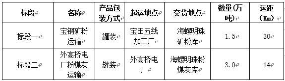 本次運輸業(yè)務(wù)為我公司采購寶鋼散罐礦粉和外高橋電廠散罐粉煤灰的運輸:一共分為兩個標(biāo)段:標(biāo)段一:寶鋼礦粉運輸--依據(jù)招標(biāo)文件