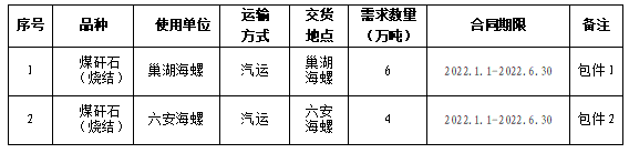 巢湖海螺水泥有限責(zé)任公司、六安海螺水泥有限責(zé)任公司擬對2022年上半年煤矸石(燒結(jié))采購進(jìn)行公開招標(biāo),選定中標(biāo)人?,F(xiàn)將相關(guān)事宜公告如下: