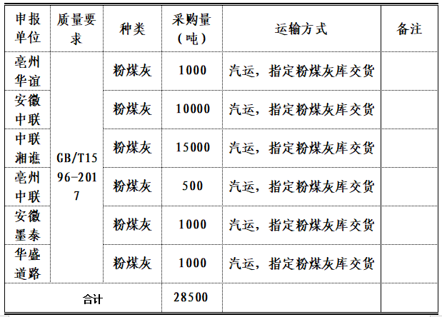 亳州華誼、安徽中聯(lián)、中聯(lián)湘譙、亳州中聯(lián)、安徽墨泰和華盛道路粉煤灰合同將于2021年12月31日到期。為保證合同到期后粉煤灰供貨的有序銜接,根據(jù)《物資采購(gòu)招標(biāo)管理辦法》和《物資采購(gòu)招標(biāo)實(shí)施細(xì)則》相關(guān)制度要求,擬采取公開(kāi)招標(biāo)方式實(shí)施,選定中標(biāo)人?,F(xiàn)將相關(guān)事宜公告如下: