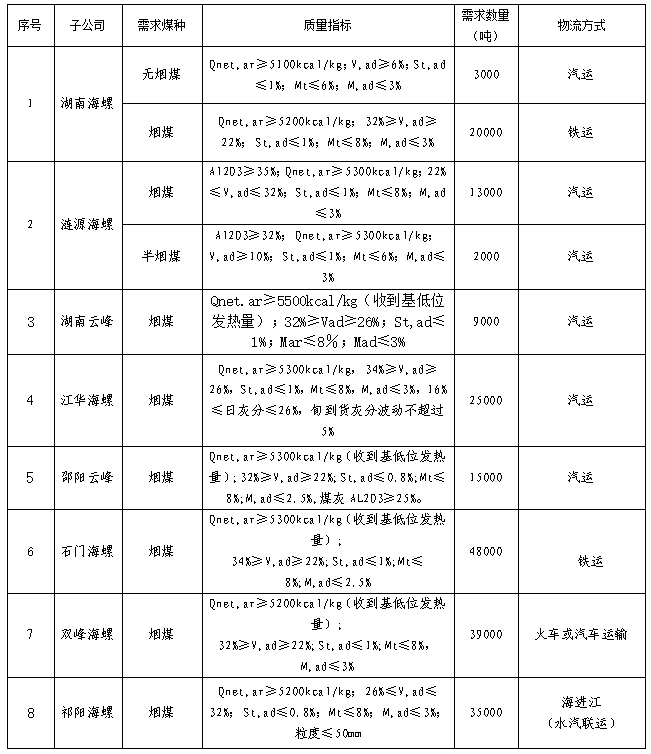 根據(jù)2021年12月21日-2022年1月20日海螺水泥湖南區(qū)域各子公司煤炭需求,現(xiàn)擬對煤炭進行公開招標,選定中標人,為體現(xiàn)公平、公正、公開的原則,拓寬采購渠道,現(xiàn)將招標相關事宜公告如下: