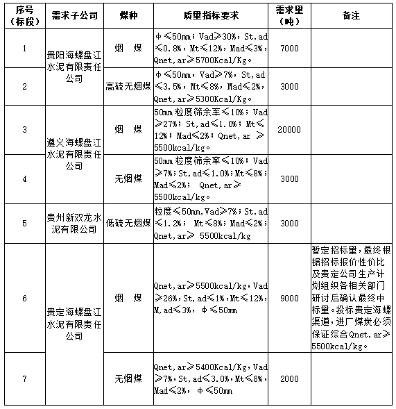 海螺水泥貴州區(qū)域擬對2022年1月21日至2022年2月20日生產(chǎn)用煤炭進(jìn)行公開招標(biāo),選定中標(biāo)單位,現(xiàn)將相關(guān)招標(biāo)事宜公示如下: