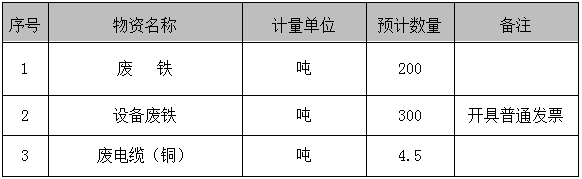 備注:回收商負(fù)責(zé)人工、氧氣、乙炔切割;自備吊車、叉車、鏟車、運(yùn)輸車輛、裝車、工具等;包含清理場(chǎng)地垃圾費(fèi)用。