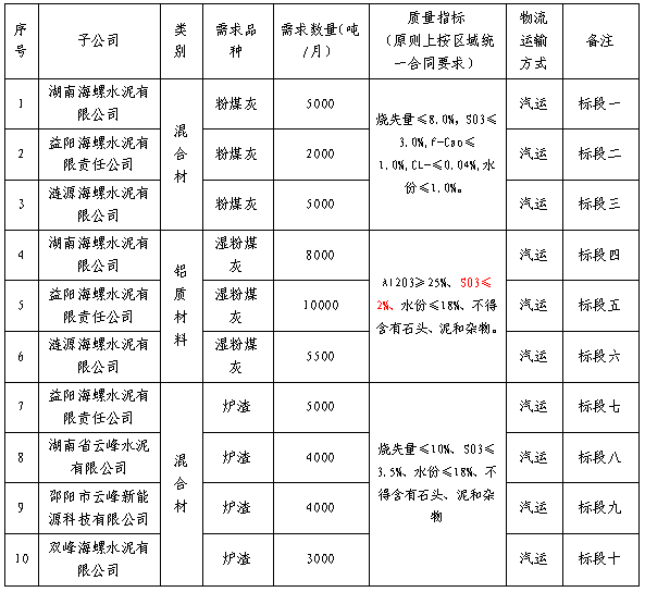 根據(jù)湖南、漣源、雙峰、益陽海螺、湖南云峰和邵陽云峰六家公司2022年3月1日至2022年8月31日電廠廢渣(含粉煤灰、濕粉煤灰、爐渣等)的需求,現(xiàn)擬對電廠廢渣進(jìn)行招標(biāo),選定中標(biāo)人,為體現(xiàn)公平、公正、公開的原則,拓寬采購渠道,現(xiàn)通過海螺物資陽光采購平臺(登陸網(wǎng)址:ygcg.conch.cn)進(jìn)行公開招標(biāo),招標(biāo)相關(guān)事宜公告如下: