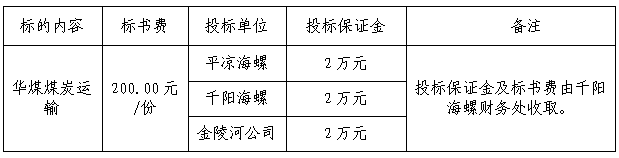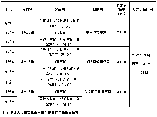 現(xiàn)對平?jīng)龊B?、千陽海螺和金陵河公?022年華亭煤炭運(yùn)輸組織公開招標(biāo),為進(jìn)一步體現(xiàn)公平、公正、公開透明的原則,現(xiàn)將招標(biāo)信息發(fā)布如下: