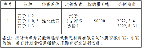 為做好2022年3-8月份淮北優(yōu)石新型環(huán)保建材有限責(zé)任公司(以下簡稱:淮北優(yōu)石)至安徽中聯(lián)、中聯(lián)湘譙骨料運輸招標工作,由安徽海螺綠色新材料有限公司采購部牽頭,對上述線路骨料運輸進行公開招標,特將本次招投標的有關(guān)事宜公告如下: