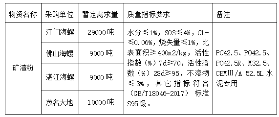 按照廣東區(qū)域供應(yīng)專業(yè)組2022年招標(biāo)計劃安排,安徽海螺水泥股份有限公司廣東區(qū)域下屬的江門海螺、佛山海螺、湛江海螺、茂名大地四家公司擬對2022年2季度礦渣粉采購進行聯(lián)合公開招標(biāo),為進一步體現(xiàn)公平、公正、公開的原則,拓寬采購渠道,提高采購質(zhì)量,現(xiàn)將相關(guān)事宜公告如下: