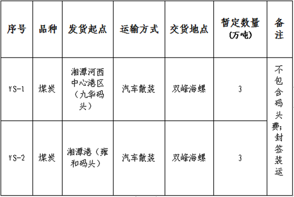 1、招標內(nèi)容:湘潭河西中心港區(qū)(九華碼頭)、湘潭港(雍和碼頭)至雙峰海螺的煤炭中轉(zhuǎn)運輸。