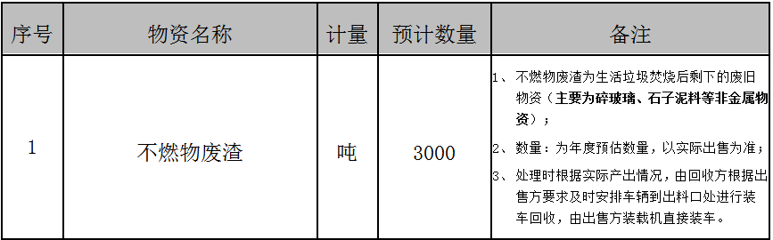 2. 不燃物廢渣為生活垃圾焚燒系統(tǒng)焚燒后的廢舊物資,從中標(biāo)日起截止2023年4月14日期間垃圾焚燒所產(chǎn)生的不燃物廢渣,均由中標(biāo)單位根據(jù)招標(biāo)方要求分批次進(jìn)行回收,現(xiàn)場(chǎng)直接裝車過(guò)磅,所產(chǎn)生的一切費(fèi)用包含在投標(biāo)報(bào)價(jià)內(nèi)。