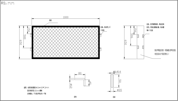 所有網(wǎng)孔統(tǒng)一規(guī)格:長(zhǎng)節(jié)距22mm,短節(jié)距15mm,梗寬2mm。邊框角鐵:40*40*3mm;連接方式分A和B兩種,詳見(jiàn)圖紙。 |