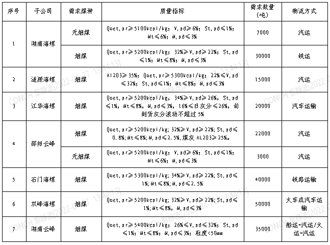 根據(jù)2022年5月21日-2022年6月20日海螺水泥湖南區(qū)域各子公司煤炭需求,現(xiàn)擬對煤炭進行公開招標,選定中標人,為體現(xiàn)公平、公正、公開的原則,拓寬采購渠道,現(xiàn)將招標相關事宜公告如下: