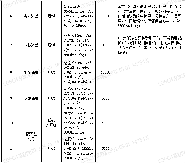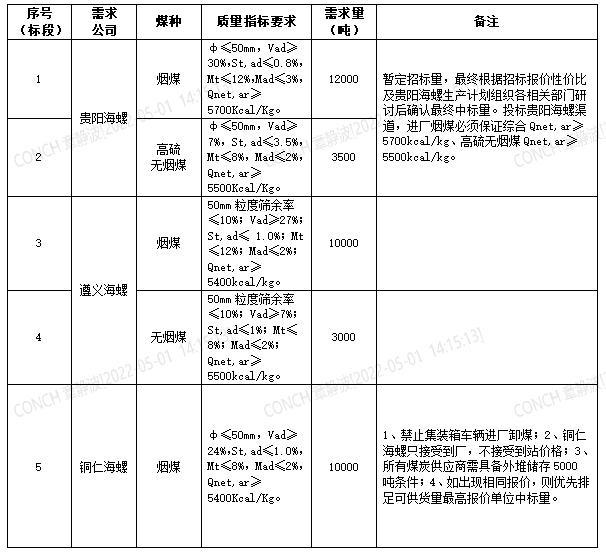海螺水泥貴州區(qū)域擬對2022年5月21日至2022年6月20日生產(chǎn)用煤炭進行公開招標,選定中標單位,現(xiàn)將相關(guān)招標事宜公示如下: